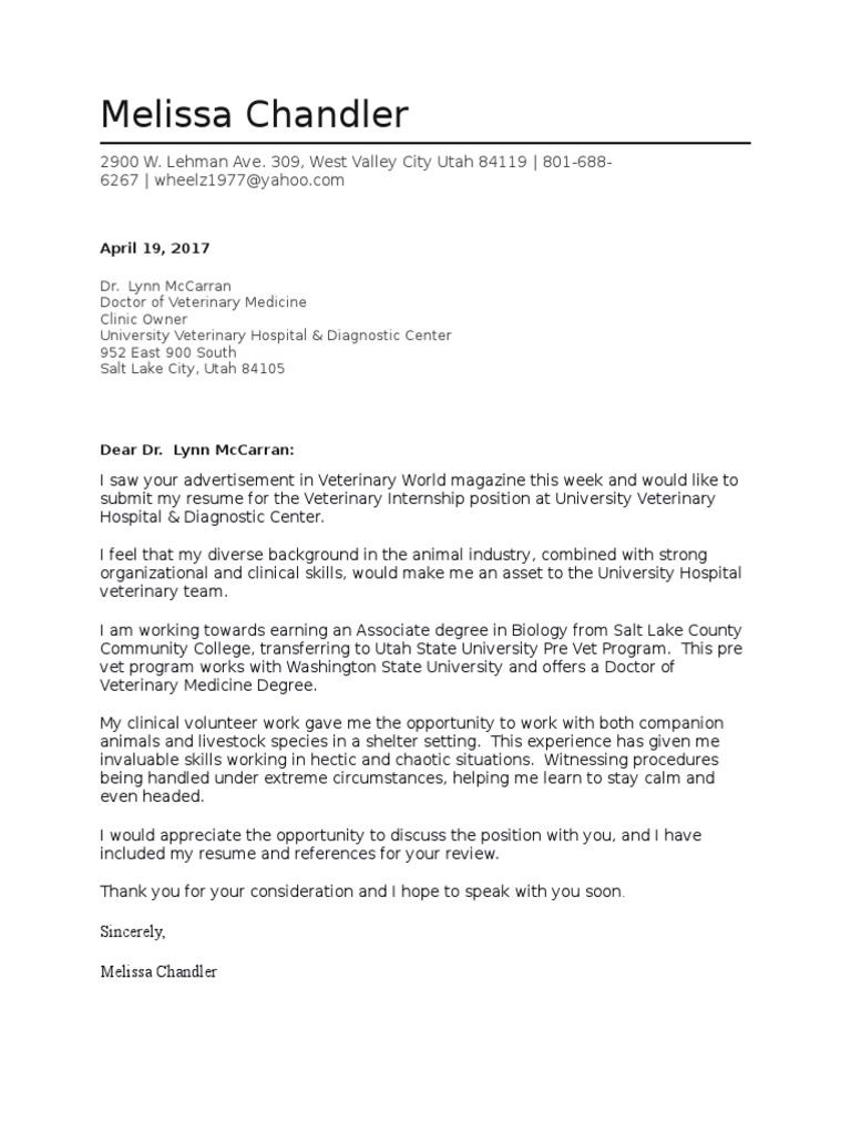 Brodsky, i would like to apply for the veterinarian position with new parkland animal hospital. Companion animal veterinarians, food animal veterinarians, equine veterinarians, food safety veterinarians, and research veterinarians. I am extremely confident that you will find me to be an outstanding candidate for your veterinarian position. Essay paper help 'if you haven't already tried taking essay paper help from tfth, i strongly cover letter sample for veterinary doctors suggest that you do so right away. There are multiple types of veterinarian, depending on their activity: